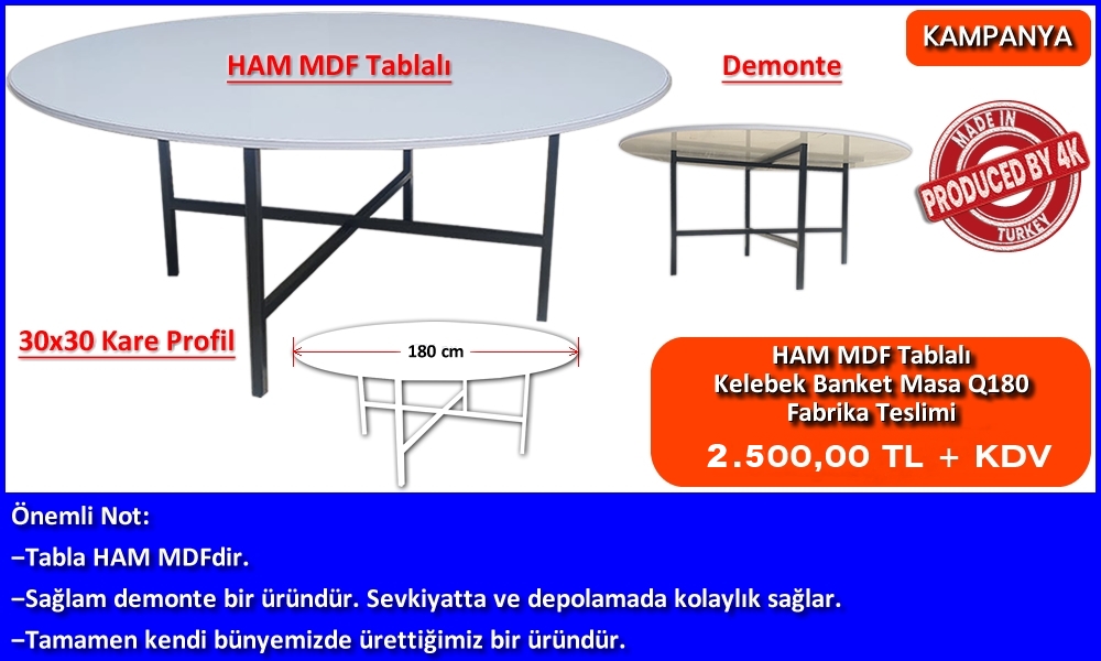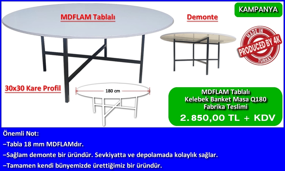 | PVC Çerçeveli Beyaz MDFLAM Tablalı | 3.000,00 TL + KDV | Alüminyum Çerçeveli Beyaz MDFLAM Tablalı | Fiyat Sorunuz. | | Yuvarlak Banket Masa Q160 cm | HAM MDF Tablalı | Fiyat Sorunuz. | PVC Çerçeveli Beyaz MDFLAM Tablalı | 3.100,00 TL + KDV | | Beyaz MDFLAM Tablalı | Fiyat Sorunuz. | | Yuvarlak Banket Masa Q180 cm | HAM MDF Tablalı | Fiyat Sorunuz. | PVC Çerçeveli Beyaz MDFLAM Tablalı | 3.150,00 TL + KDV | Alüminyum Çerçeveli Beyaz MDFLAM Tablalı | Fiyat Sorunuz. | İstoç Teslimi 10 Adet ve Üzeri | Yuvarlak Banket Masa Q140 cm | HAM MDF Tablalı | Fiyat Sorunuz. | PVC Çerçeveli Beyaz MDFLAM Tablalı | 3.250,00 TL + KDV | | Beyaz MDFLAM Tablalı | Fiyat Sorunuz. | | Yuvarlak Banket Masa Q160 cm | HAM MDF Tablalı | Fiyat Sorunuz. | PVC Çerçeveli Beyaz MDFLAM Tablalı | 3.350,00 TL + KDV | | Beyaz MDFLAM Tablalı | Fiyat Sorunuz. | | Yuvarlak Banket Masa Q180 cm | HAM MDF Tablalı | Fiyat Sorunuz. | PVC Çerçeveli Beyaz MDFLAM Tablalı | 3.400,00 TL + KDV | | Beyaz MDFLAM Tablalı | Fiyat Sorunuz. | İstoç Teslimi 1-9 Adet | Yuvarlak Banket Masa Q140 cm | HAM MDF Tablalı | Fiyat Sorunuz. | PVC Çerçeveli Beyaz MDFLAM Tablalı | Fiyat Sorunuz. | Alüminyum Çerçeveli Beyaz MDFLAM Tablalı | Fiyat Sorunuz. | | Yuvarlak Banket Masa Q160 cm | HAM MDF Tablalı | Fiyat Sorunuz. | PVC Çerçeveli Beyaz MDFLAM Tablalı | Fiyat Sorunuz. | | Beyaz MDFLAM Tablalı | Fiyat Sorunuz. | | Yuvarlak Banket Masa Q180 cm | HAM MDF Tablalı | Fiyat Sorunuz. | PVC Çerçeveli Beyaz MDFLAM Tablalı | Fiyat Sorunuz. | Alüminyum Çerçeveli Beyaz MDFLAM Tablalı | Fiyat Sorunuz. | - Fiyatlarımız Beyaz ve Bej Mdf-Lam Renkleri için Geçerlidir. Ahşap Desenli Mdf-Lam Renklerinde Fiyat Farkı Uygulanır. - Fiyatlarımız Siyah, Gri ve Bej Metal Renkleri için Geçerlidir. Metalik Renklerde Fiyat Farkı Uygulanır. | |
