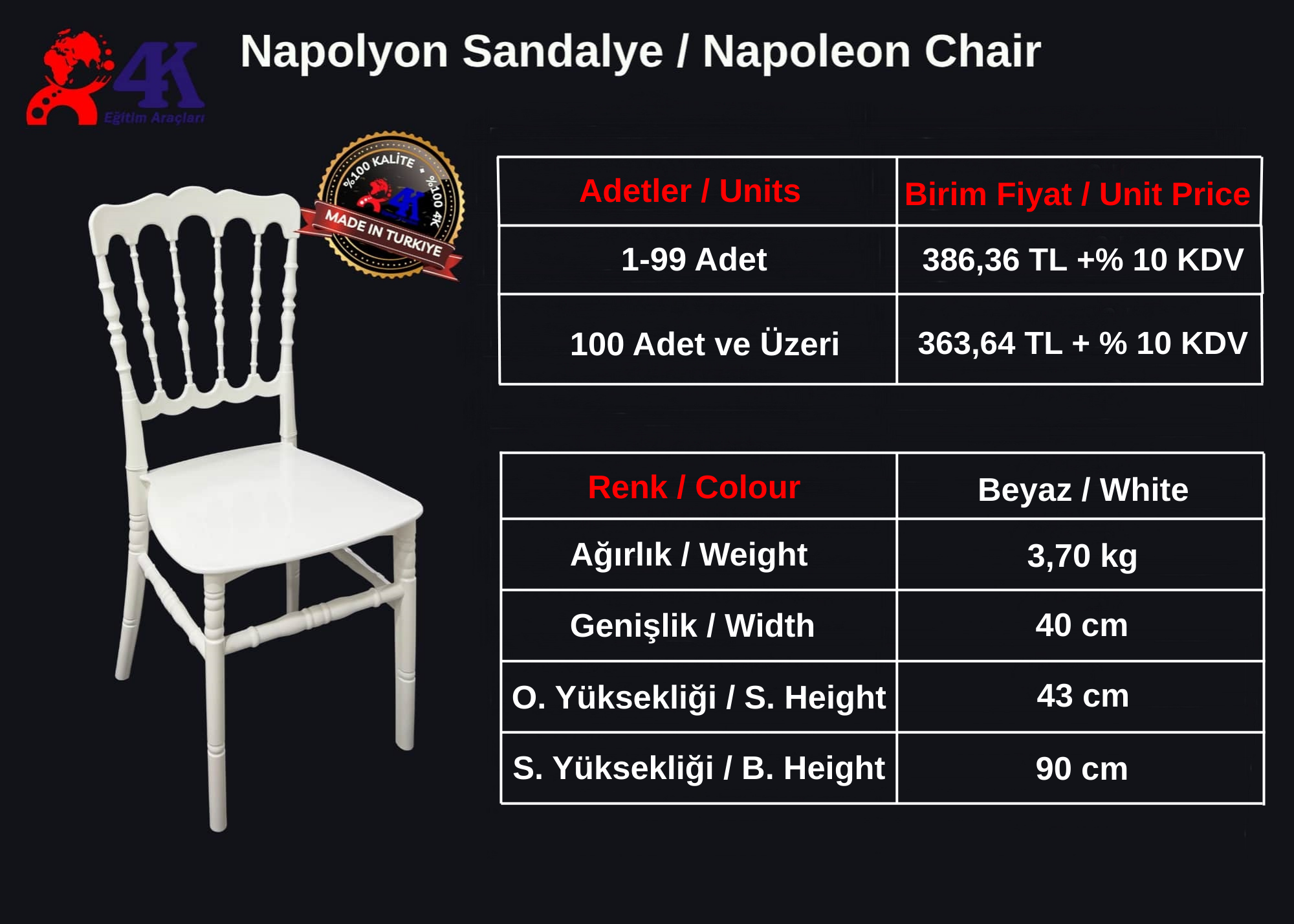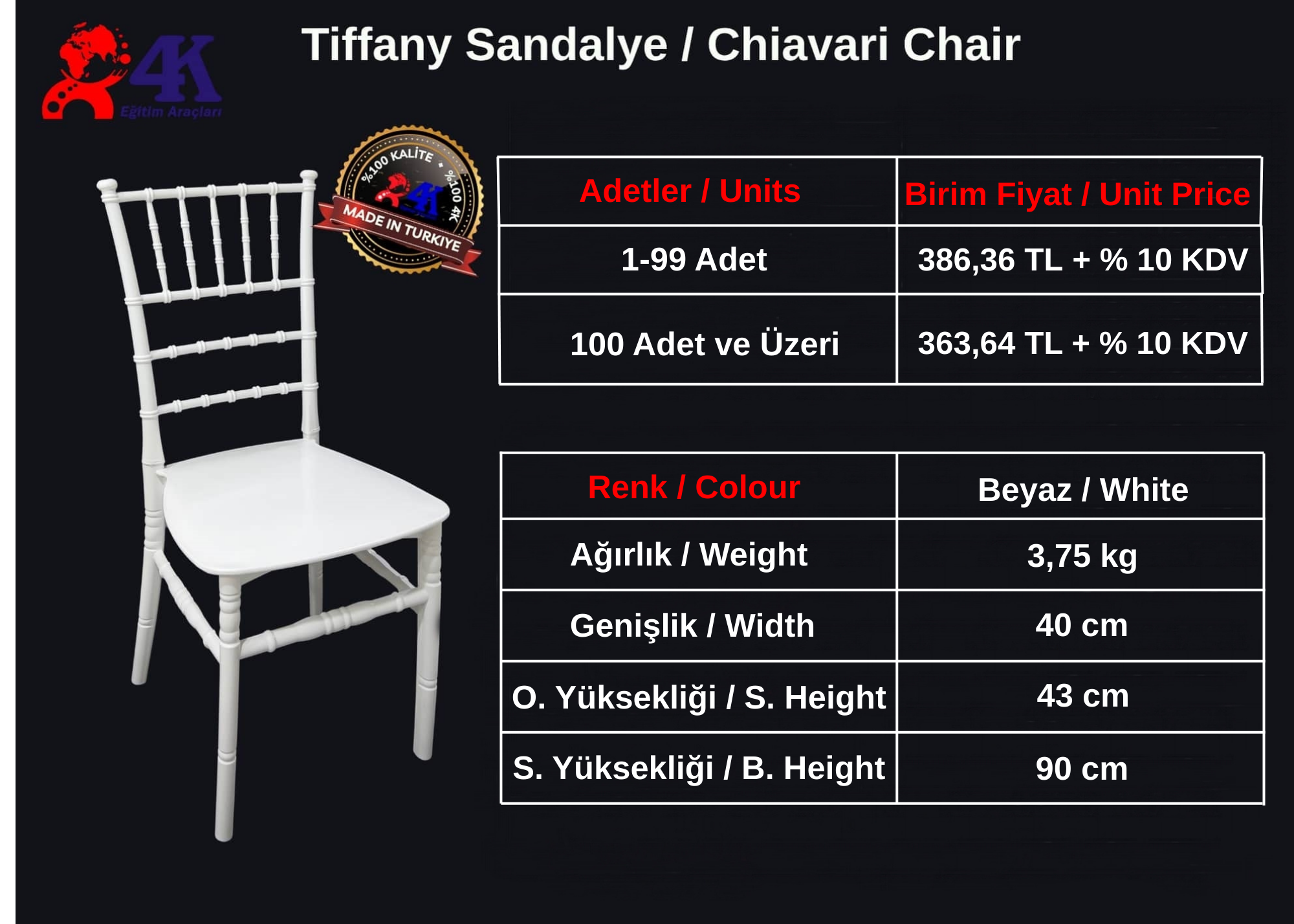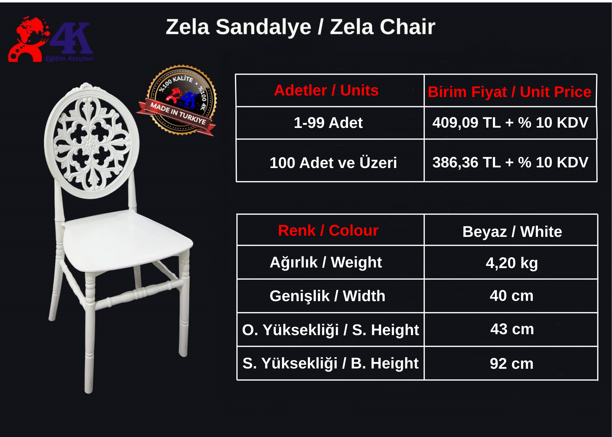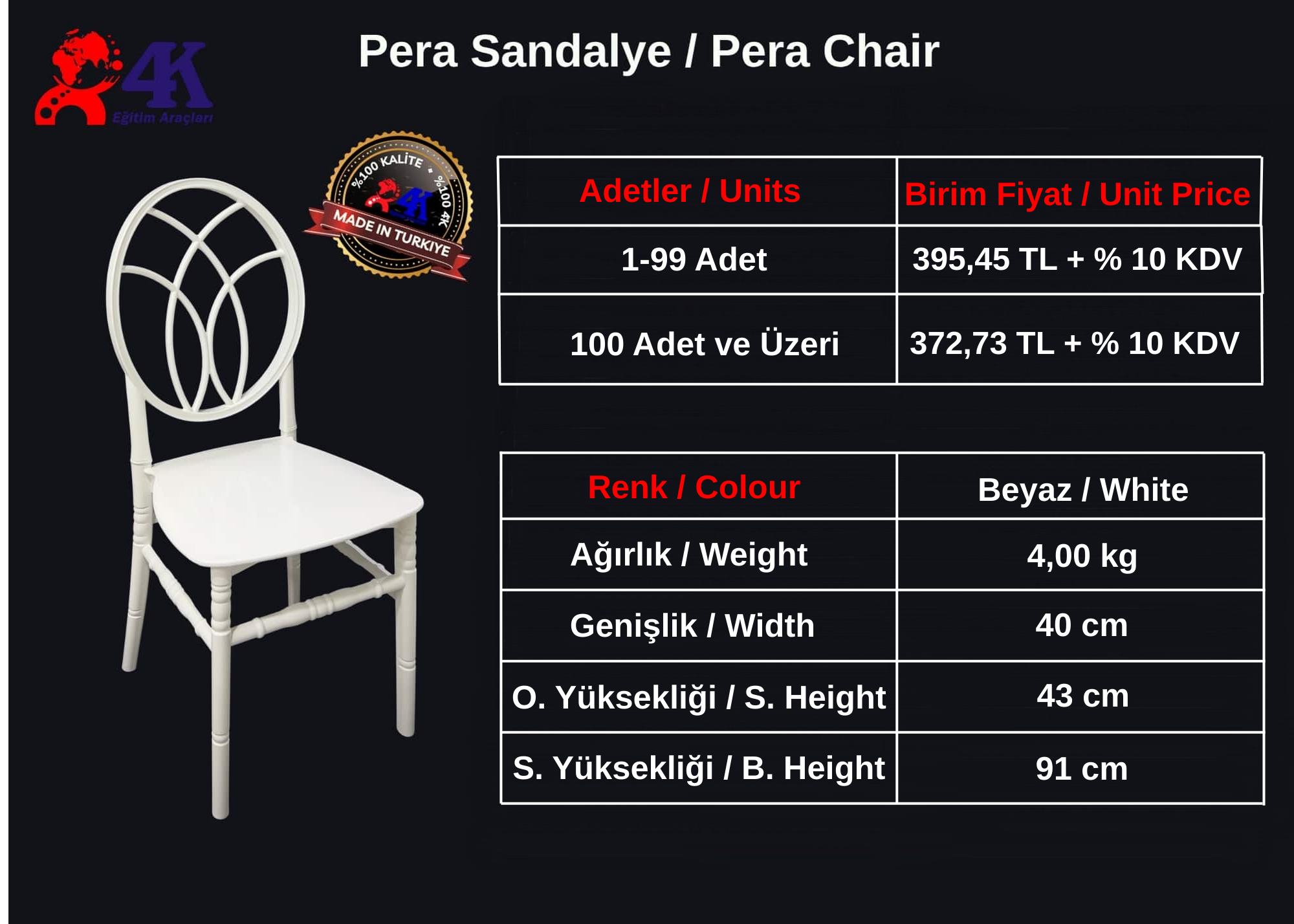| | POLİKARBON SANDALYE FİYATLARI | Floria Sandalye (PP / Policarbon) (4'lü Paket) | | | Ağırlık | Genişlik | Derinlik | Yükseklik | | 4400 gr | 48 cm | 46 cm | 94 cm | | Paket | 20 DC Konteyner | 40 HC Konteyner | Tır | | 4'lü Paket | 264 Adet | 600 Adet | 900 Adet | | PP Hammadde | Parlak Beyaz, Parlak Siyah | Fiyat Sorunuz | | Policarbon Hammadde | Beyaz Şeffaf, Siyah Şeffaf, Sarı Şeffaf | Fiyat Sorunuz | | Minumum 200 Adet Sipariş Alınmaktadır. | | | | Floria Koltuk (PP / Policarbon) (4'lü Paket) | | | Ağırlık | Genişlik | Derinlik | Yükseklik | | 5000 gr | 55 cm | 46 cm | 94 cm | | Paket | 20 DC Konteyner | 40 HC Konteyner | Tır | | 4'lü Paket | 264 Adet | 600 Adet | 900 Adet | | PP Hammadde | Parlak Beyaz, Parlak Siyah | Fiyat Sorunuz | | Policarbon Hammadde | Beyaz Şeffaf, Siyah Şeffaf, Sarı Şeffaf | Fiyat Sorunuz | | Minumum 200 Adet Sipariş Alınmaktadır. | |  | | |