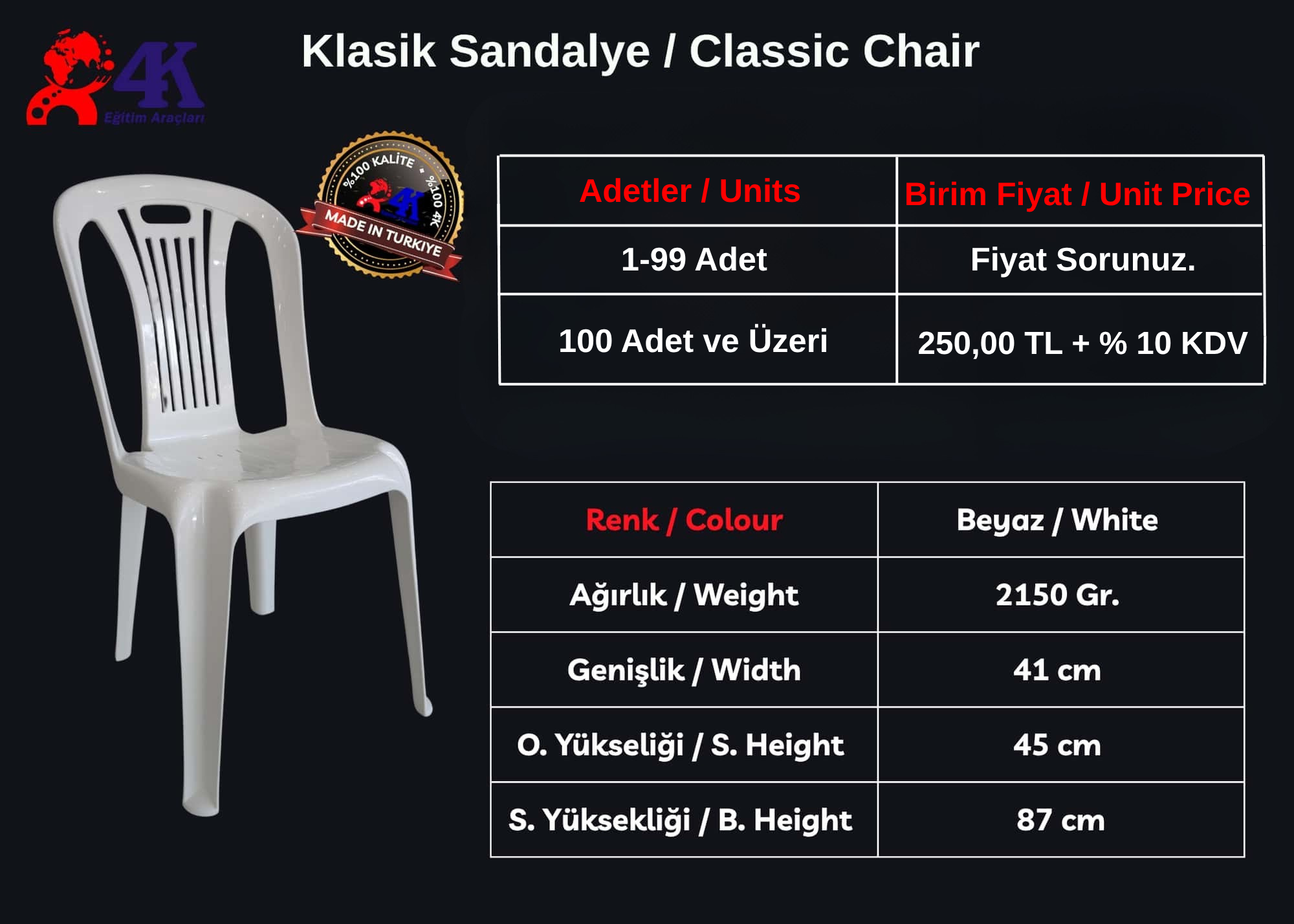 | | Plastik Pluto Sandalye (6'lı Paket) | | Beyaz, Bej, Siyah, Turuncu, Yeşil, Turkuaz | | Ağırlık | Genişlik | Derinlik | Yükseklik | | 3850 gr | 41 cm | 45 cm | 86 cm | Paket | 20 DC Konteyner | 40 HC Konteyner | Tır | | 6'lı Paket | 360 Adet | 972 Adet | 1350 Adet | | Fiyat Sorunuz | | Minumum 200 Adet Sipariş Alınmaktadır. | | | Plastik Roma Sandalye (6'lı Paket) | | Beyaz, Bej, Siyah, Turuncu, Yeşil, Turkuaz, Kapuçino, Koyu Kahve, Beyaz-Koyu Kahve, Beyaz-Siyah | | Ağırlık | Genişlik | Derinlik | Yükseklik | | 3800 gr | 41 cm | 45 cm | 86 cm | Paket | 20 DC Konteyner | 40 HC Konteyner | Tır | | 6'lı Paket | 360 Adet | 972 Adet | 1350 Adet | | Fiyat Sorunuz | | Minumum 200 Adet Sipariş Alınmaktadır. | | | Plastik Platinyum Sandalye (6'lı Paket) | | Gri, Koyu Kahve, Kapuçino, Bej | | Ağırlık | Genişlik | Derinlik | Yükseklik | | 5000 gr | 47 cm | 50 cm | 98 cm | Paket | 20 DC Konteyner | 40 HC Konteyner | Tır | | 6'lı Paket | 264 Adet | 600 Adet | 720 Adet | | Fiyat Sorunuz | | Minumum 200 Adet Sipariş Alınmaktadır. | | | Plastik Platinyum Koltuk (6'lı Paket) | | Gri, Koyu Kahve, Kapuçino, Bej | | Ağırlık | Genişlik | Derinlik | Yükseklik | | 5000 gr | 47 cm | 50 cm | 98 cm | Paket | 20 DC Konteyner | 40 HC Konteyner | Tır | | 6'lı Paket | 264 Adet | 600 Adet | 720 Adet | | Fiyat Sorunuz | | Minumum 200 Adet Sipariş Alınmaktadır. | | | Plastik Monaco Sandalye (6'lı Paket) | | Beyaz, Turuncu, Turkuaz, Zeytin Yeşili, Bej, Kapuçino, Siyah | | Ağırlık | Genişlik | Derinlik | Yükseklik | | 5500 gr | 56 cm | 41 cm | 82 cm | Paket | 20 DC Konteyner | 40 HC Konteyner | Tır | | 6'lı Paket | 264 Adet | 600 Adet | 720 Adet | | Fiyat Sorunuz | | Minumum 200 Adet Sipariş Alınmaktadır. | | | Plastik Monaco Koltuk (6'lı Paket) | | Beyaz, Turuncu, Turkuaz, Zeytin Yeşili, Bej, Kapuçino, Siyah | | Ağırlık | Genişlik | Derinlik | Yükseklik | | 5500 gr | 46 cm | 41 cm | 82 cm | Paket | 20 DC Konteyner | 40 HC Konteyner | Tır | | 6'lı Paket | 264 Adet | 600 Adet | 720 Adet | | Fiyat Sorunuz | | Minumum 200 Adet Sipariş Alınmaktadır. | | | Plastik Piknik Sandalye (4'lü Paket) | | Beyaz, Turuncu, Turkuaz, Zeytin Yeşili, Bej, Kapuçino, Siyah | | Ağırlık | Genişlik | Derinlik | Yükseklik | | 4400 gr | 47 cm | 47 cm | 88 cm | Paket | 20 DC Konteyner | 40 HC Konteyner | Tır | | 4'lü Paket | 1056 Adet | 2400 Adet | 3600 Adet | | Fiyat Sorunuz | | Minumum 200 Adet Sipariş Alınmaktadır. | | | | D Sandalye | Tonet Sandalye | | | | Fiyat Sorunuz | Fiyat Sorunuz | | |  |  | | | Güncelleme Tarihi: 07.04.2026 | |